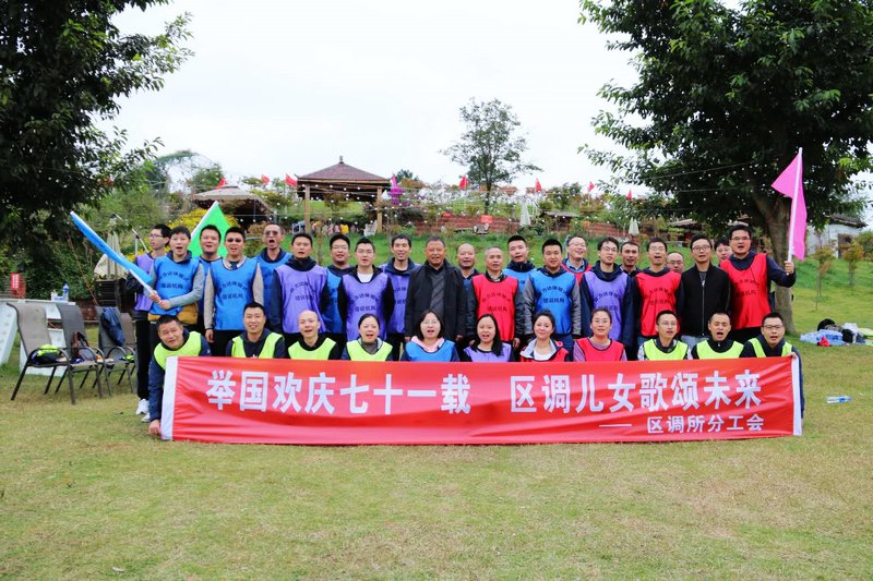 区调所分工会为了增强职工爱国热情,憧憬地质未来,于10月13日在天府新区万安镇开展“举国欢庆七十一载,区调儿女歌颂未来”的主题工会活动。内容包括热身小游戏、智力气势比拼、才艺表演、“盲人瞎打”游戏、“手足协调”游戏、“夺宝奇兵”游戏等。